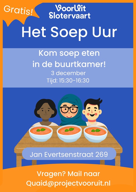 Daarom organiseren we op woensdag 3 december het allereerste Soepuurtje in buurtkamer Buurtkracht. Een fijne, laagdrempelige middag waar iedereen welkom is om aan te schuiven voor een kopje soep, om bij te praten en nieuwe contacten te leggen.