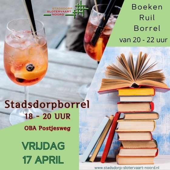 Op vrijdag 17 april is weer de maandelijkse Stadsdorpborrel. Deze keer gaan we na het borrelen weer een boekenruilborrel doen! Neem een paar boeken mee die je anderen kan aanbevelen. Maak kennis met andere boekenlezers en luister naar hun tips. Inloop vanaf 18.00 uur. Je kunt een kopje soep mee-eten voor 3,50 euro. Neem zelf iets te drinken mee. Locatie: OBA Postjesweg.